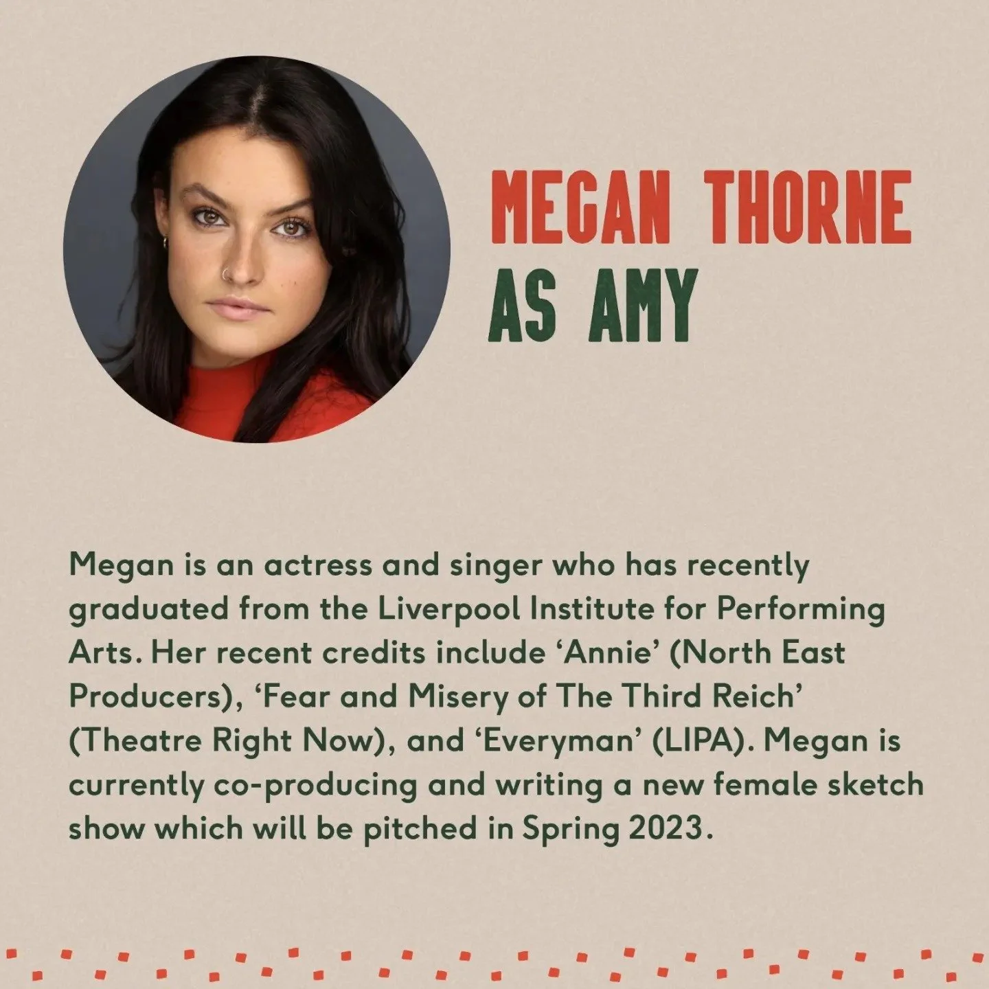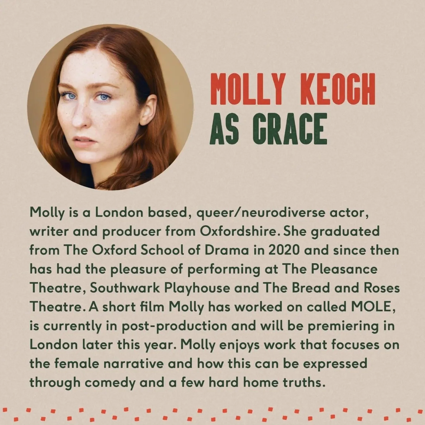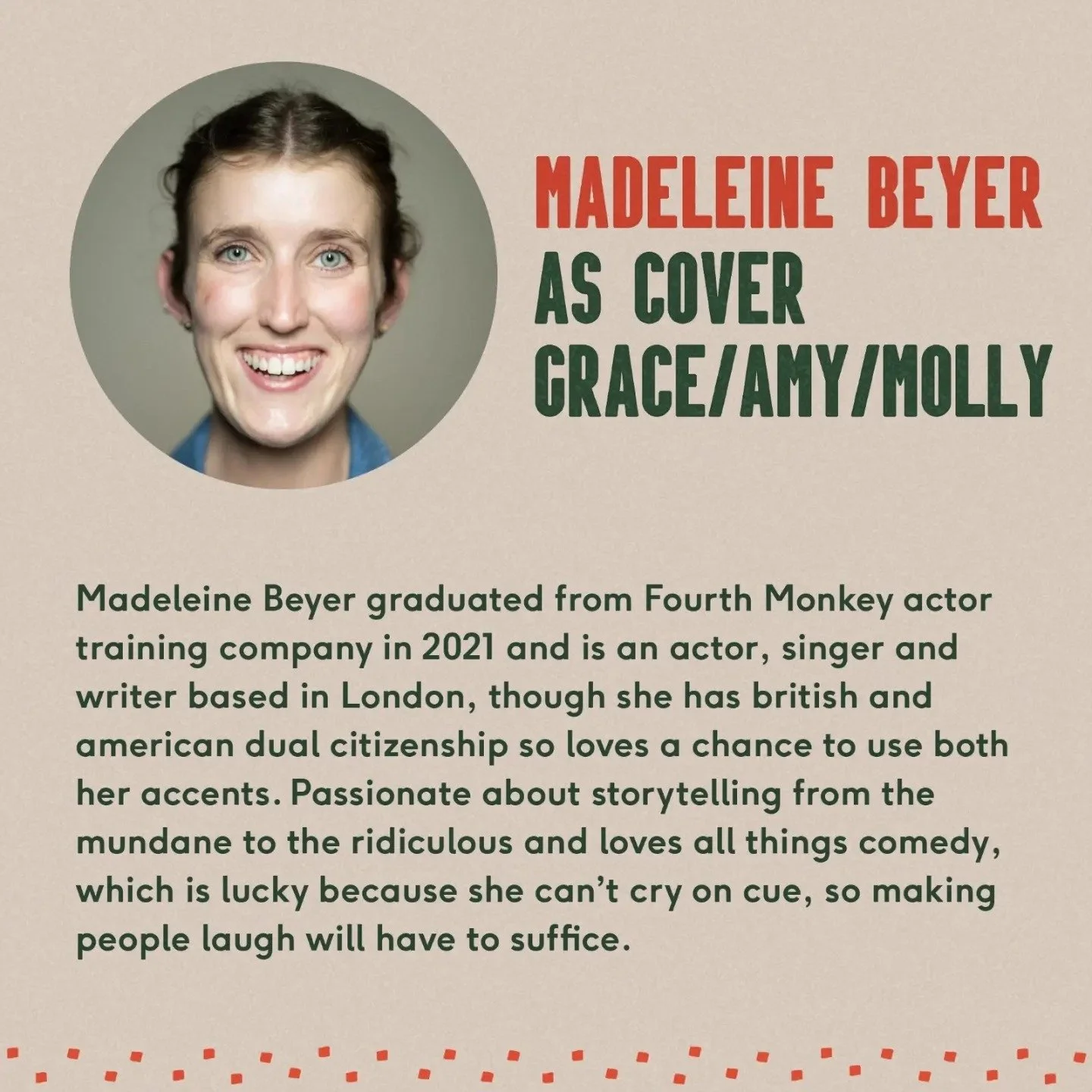 Cecilie Fray is a director and collaborator, and most recently has been the returning Assistant Director on Moulin Rouge! The Musical at The Piccadilly Theatre in London. As well as this, she has been engaging frequently in the directing of new, independent work at a variety of scratch nights across London in the past few years. Her key focus is amplifying women’s voices within comedy.